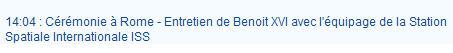 Benoît XVI sera en liaison satellitaire avec la Station spatiale internationale (ISS) le 21 mai à 13h56, à l'occasion de la dernière mission de la navette Endeavour.