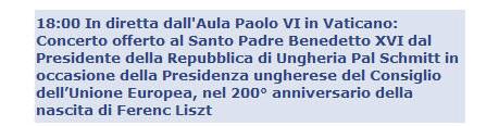 Vendredi 27 mai, à 18 heures, le président de la république de Hongrie, Pal Schmitt, offrira au Pape Benoît XVI, dans la salle Paul VI, un concert, pour célébrer à la fois la présidence hongroise du Conseil de l'Union Européenne, et le 200e anniversaire de la naissance de Franz Liszt (source: Telepace).