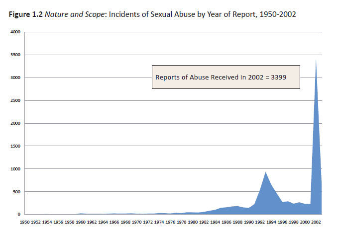 Un autre fait, confirmé par les mises à jour 2003-2005 et aujourd'hui 2006-2009 des données du rapport de 2004, est que le nombre d'abus de mineurs par des prêtres catholiques diminue d'année en année de manière vraiment significative. Le premier graphique de ce rapport (fig. 1, p. 8) montre un pic au début des années 1980 et une descente qui devient très rapide ces dernières années, pour atteindre aujourd'hui des niveaux encore plus bas qu'au début des années 1950.