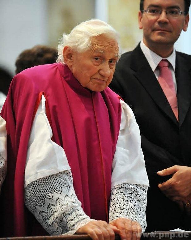 Georg Ratzinger, le frère du Pape, âgé de 87 ans, a assisté à une cérémonie religieuse pour célébrer le jubilé du soixantième anniversaire de l'ordination sacerdotale du pape (ndt: photo ci-contre).