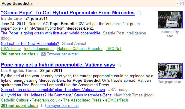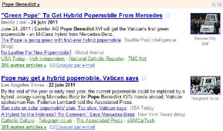 Eh bien, non; l'information la plus fréquente concernait un véhicule hybride fabriqué par Mercedes pour la prochaine visite du pape en Allemagne.