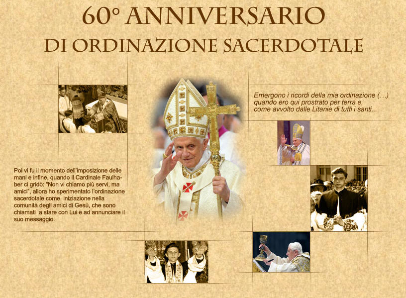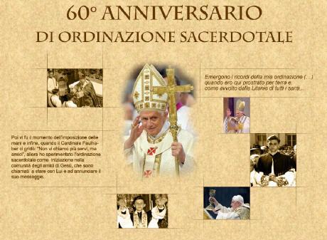 Le Vatican a mis en ligne une page spéciale pour célébrer les 60 ans de sacerdoce. Avec une extraordinaire video de l' ordination, et le discours prononcé par le Saint Père le 14 septembre 2006 à la cathédrale de Freising, lors de sa visite en Bavière (28/6/2011).