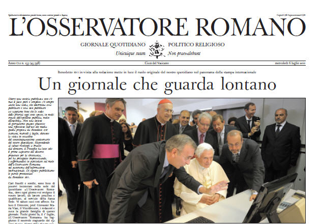Accueilli par le Directeur Giovanni Maria Vian et le Directeur adjoint Carlo Di Cicco, Papa Ratzinger était accompagné du secrétaire d'Etat, Tarcisio Cardinal Bertone. La visite s'est déroulée dans une ambiance familiale. L'Osservatore Romano, pour le pape est «son» journal.