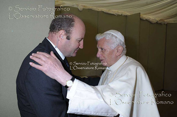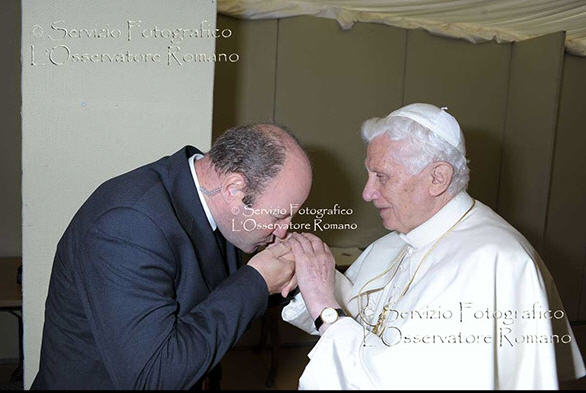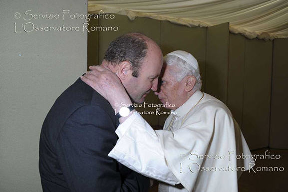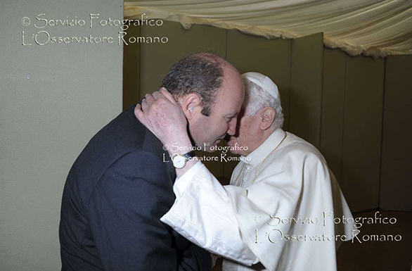 Benoît XVI , que je ne connais pas mais qui a une réputation de froideur (injustifiée), de maîtrise parfaite de lui-même (ce qui est vrai) m'est apparu tout à coup sous un jour différent. L'expression de son visage, le geste de son bras m'ont fait penser à une certaine vulnérabilité. J'ai eu l'impression que cette rencontre n'était pas ordinaire, qu'il était touché, qu'il cherchait un certain réconfort..