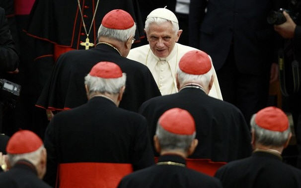 Si à son arrivée et lors de son départ Benoît XVI a été suivi par la caméra, pendant la durée du concert seuls l'orchestre et la chorale ont occupé l'écran. Je me garderai bien de faire un quelconque commentaire sur les morceaux interprétés car je n'ai aucune des qualités me permettant de m'y livrer mais je prends toujours un grand plaisir à suivre le jeu des mains des musiciens et les expressions des visages de tous les exécutants. Comment faire se réunir dans une parfaite harmonie tous les timbres de voix, toutes les richesses issues des instruments sous les doigts inspirés des musiciens; je suis toujours admirative!! Enveloppé de tant de beauté je comprends que le cœur de notre Pape soit rempli de joie. A la fin de la prestation notre Saint-Père, d'un pas alerte, est monté sur la scène pour saluer le chef d'orchestre et les autres participants. Très souriant il a remercié pour ce cadeau, je suppose, car je n'ai pas compris ce qu'il disait. Debout, il a parlé d'une voix assurée, il a terminé par sa bénédiction et posé pour la traditionnelle photo souvenir avant de regagner sa place pour rencontrer ceux qui avaient la grâce de pouvoir échanger quelques mots avec lui. Au revoir aux cardinaux et il est reparti en traversant de nouveau la salle, en répondant comme à l'aller aux très nombreuses mains tendues vers lui; j'ai eu l'impression qu'il avançait avec peine tant il montrait de disponibilité pour essayer de satisfaire le plus possible de sollicitations.