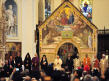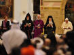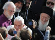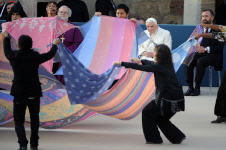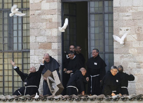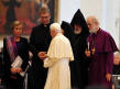 Sous les voûtes de Sainte-Marie des Anges, ils sont tous à équidistance d’un même centre habité seulement de fleurs. Benoît XVI, le pape si souvent au "sommet" des célébrations auxquelles il participe, apparaît ici à égalité avec ses invités. Une petite tache blanche au milieu des robes noires et safran, orange ou jaune, grises ou beiges des autres dignitaires religieux. Ironie de la scène : la grande majorité des hommes sont en robe, alors que Julia Kristeva, la seule femme invitée à s'exprimer, la seule aussi dans les rangs d’honneur, est en tailleur-pantalon genre Yves Saint Laurent…