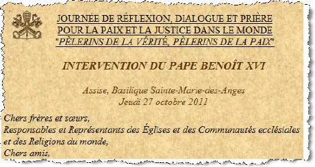 Qu'a dit vraiment le Pape, à Assise? Il est intéressant de parcourir les titres de la presse. Et il est important de revenir au discours lui-même (28/10/2011; ajout ultérieur: le boycott des grands medias)