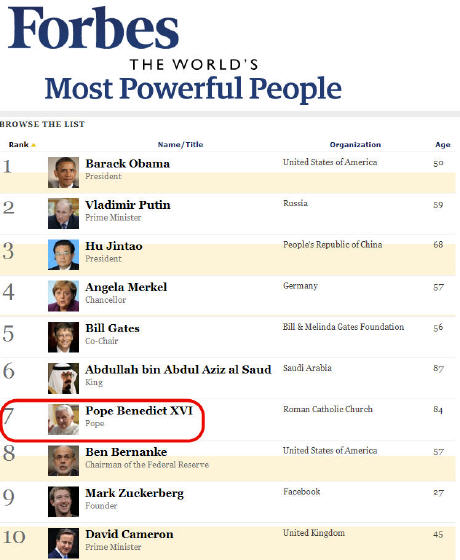 Parmi les 100 personnalités les plus puissantes au monde, Benoît XVI est en septième position. Une information que les medias français se sont bien gardés de relayer (3/11/2011)