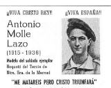 (**) Bartolomé Blanco Márquez (né en 1914), orphelin de mère à 3 ans et de père à 11 ans, issu d’un milieu très modeste, il est élevé par ses oncles et travaille très jeune comme rempailleur de chaises. Excellent orateur, il n’a que 18 ans quand il fonde dans son village natal de Pozoblanco (province de Cordoue) une section masculine de la Jeunesse de l’Action Catholique. Puis il s’intéresse à la doctrine sociale de l’Église et commence son apostolat auprès des ouvriers et il participera à des congrès à l’étranger. Quand éclate la guerre civile il est en train de faire son service militaire. De retour chez lui pour une courte permission (août 1936) il est arrêté pour son appartenance à l’Action Catholique. Ne voulant pas renier sa foi, il est fusillé le 2 octobre 1936, en criant « Vive le Christ Roi ». Il a été béatifié en 2007 par Benoît XVI (Il est fêté le 6 novembre). Voir http://www.aciprensa.com/.