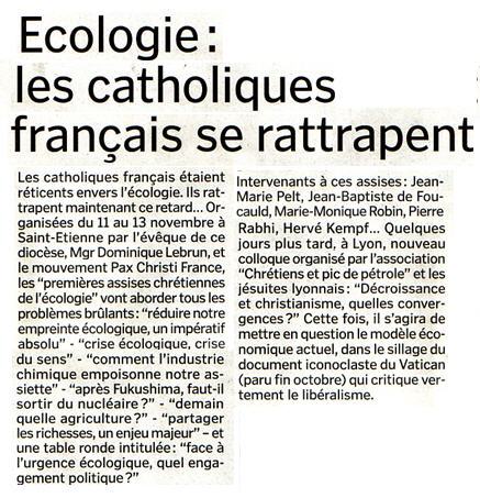 Je le mets en parallèle avec un article lu dans un journal français régional qui annonce « Les assises chrétiennes de l’écologie » organisées dans le diocèse de Saint Étienne du 11 au 13 novembre 2011: