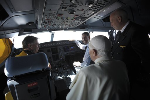 «Pour les journalistes qui suivent le pape dans ses voyages, le moment le plus excitant est l’instant où, à mi-chemin du trajet, Benoît XVI fait son apparition, accompagnée d’une suite de cardinaux en soutane filetée de rouge, et flanqué de son porte-parole, le Père Federico Lombardi, pour la fameuse interview en vol. C’est l’occasion unique, parfois rêvée pour ceux qui ne sont pas accrédités au Vatican, de voir le pape en vrai, de tout près. Et donc de jauger sa forme physique, et aussi intellectuelle.»