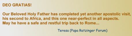 Le boycott des medias français a été, une fois encore, presque total (ils se moquent bien de l'Afrique, et ils ne parlent pas du pape lorsqu'il n'y a aucun parfum de scandale, encore moins lorsque la faiblesse de leurs arguments rend une sortie de leur part contre-productive), ce qui rend d'autant plus suspecte, avec le recul, la véritable chasse a courre du précédent voyage en Afrique, et le "piège" tendu comme par hasard par un obscur journaliste de France 2 qui n'aurait jamais fait le voyage en Afrique dans l'avion du Pape sinon.