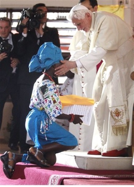 Il ne parle pas de lui pour se mettre en valeur mais pour leur dire qu'il est passé, lui aussi, par toutes les étapes qu'il évoque. Jésus est au centre de sa vie depuis sa naissance et de cela on ne peut douter. Pour rendre ses mots plus vivants Benoît XVI sort son chapelet de sa poche, gros succès auprès du jeune et moins jeune public et leur demande de prier pour lui accompagnant cette requête d'un geste de la main et du doigt ; un chapelet, cadeau magnifique , sera remis à chaque enfant participant. Il offre à la paroisse Sainte Rita d'un quartier très populaire une mosaïque représentant la Vierge et son Enfant. Il sort sous le chant du Notre Père. C'est un moment de joie pure, désordonnée mais si belle. La papamobile offre son refuge transparent contre l'enthousiasme débordant qui met le service d'ordre mal à l'aise. Il va rencontrer les évêques du Bénin à la nonciature. Le Figaro du 21/11/2011 montre une photo de Benoît XVI en visite à la paroisse Sainte Rita. Il donne la main à un petit garçon et à une petite fille eux-mêmes encadrés par deux membres du centre, une photo toute douce avec un Pape légèrement en retrait qui paraît se laisser entraîner par les enfants ; j'aime. Ici tout est informel, le Pape est ravi et le Vatican paraît bien loin. (elle est dans votre site: Nous avons besoin de rêver )