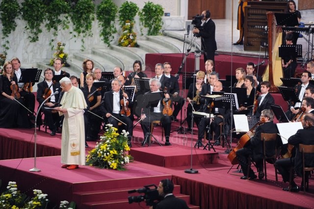 J'aime cette musique légère, plus simple, qui peut toucher un public, dont je fais partie, à la culture musicale plus sommaire. Benoît XVI n'a pas voulu de requiem, synonyme de grande musique et de thème austère; il en entend beaucoup et je suppose que le répertoire présenté lui a offert la possibilité d'écouter un autre genre, ce qu'il a paru apprécier. Les photos le montrent très souriant, prenant un bain de foule, embrassant des enfants et répondant, avec patience, gentillesse, aux personnes présentes ravies de cette entrée en matière inespérée. De plus notre Pape garde un souvenir merveilleux des JMJ de Madrid et je pense que sa délicatesse naturelle l'a fait se tourner vers des œuvres lui parlant de ce pays, de sa chaleur, de sa joie, de son exubérance mais aussi de sa foi. Il ne faut pas oublier que notre Pape est originaire de la Bavière et que la foi de son enfance a été une foi joyeuse.