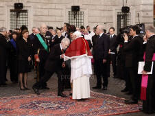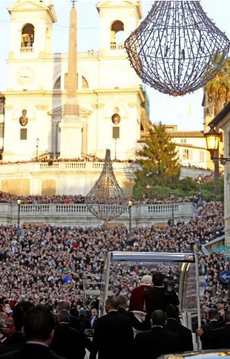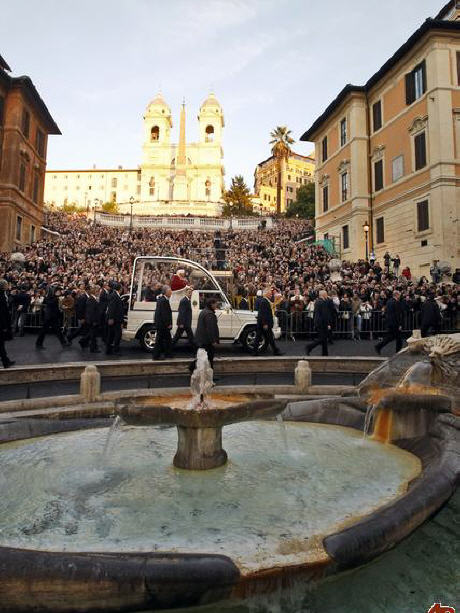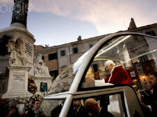 Benoît XVI est passé lentement entre ces deux ailes interrompues de foule, depuis la Porte Sainte Anne, au Vatican, jusqu'à l'une des des plus belles places de Rome. Même l'arrêt habituel en face de l'église de Santo Stefano, dans la Via Condotti, pour le traditionnel hommage du calice par les commerçants, est passé presque inaperçu, caché à la vue par l'énorme affluence de gens sur les côtés de la rue jusqu'en haut de l'escalier de la Trinité des Monts. Impressionnant, en raison de la présence débordante de cette foule, le silence qui a accompagné la prière du Pontife. A ses côtés, il y avait entre autres, les cardinaux Vallini, Cañizares, Herranz et Ouellet... Parmi les autorités présentes, l'ambassadeur d'Espagne auprès du Saint-Siège, Mme María Jesús Figa López-Palop, le maire de Rome Alemanno avec son épouse, et le président de la région Lazio, Polverini.