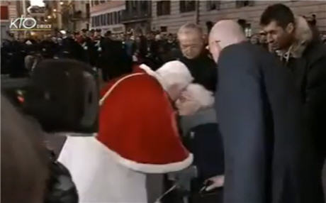 Vers 28 minutes, il y a l'image fugitive et très belle d'une femme en fauteuil roulant vers laquelle le saint-Père se penche pour l'embrasser. Capture d'écran (médiocre, hélas!) ci-contre.