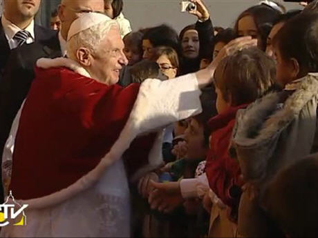 Benoît XVI a commencé sa visite pastorale à la paroisse romaine de Santa Maria delle Grazie à Casal Boccone. L'église a été consacrée l'année dernière, elle est situé près du Périphérique, dans la zone nord de Rome. Le territoire de la paroisse est composée de jeunes familles et d'une importante communauté d'immigrés; particulièrement active dans la vie paroissiale est la communauté philippine. Le Pape avant d'entrer dans l'église a salué les nombreux enfants qui l'ont accueilli dans la cour.