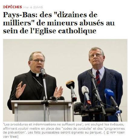 L'information selon laquelle, aux Pays-Bas: des "dizaines de milliers" (???) de mineurs auraient été abusés au sein de l'Eglise catholique (voir ici) entre 1945 et 2010, s'inscrit dans la même perpective, celle d'une Eglise qui a cru s'"ouvrir" sur le monde, mais que le monde n'a pas pour autant cessé de haïr, et sur laquelle il se venge aujourd'hui de sa complicité passée.