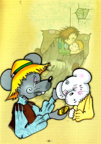 Le Roi Buby voulut accompagner son nouveau compagnon. Pérez le souriceau, se lissant les moustaches, hésita un instant devant une telle responsabilité, puis vaincu par la vanité, il accepta. Ils décidèrent de se rendre d’abord au 8, rue Arenal (**), dans les sous-sols d’une fameuse épicerie dont le patron s’appelait Carlos Prats. Là, Pérez le souriceau avait installé son foyer en face d’une grande pile de fromage de Gruyère. L’enfant Roi s’apprêtait à mettre une petite blouse pour cette expédition nocturne mais le souriceau lui sauta sur l’épaule et de sa queue chatouilla le nez du petit garçon, ce qui le fit éternuer et …le transforma en un magnifique petit rongeur vêtu d’un splendide costume d’or et de soie et aux yeux verts et brillants comme deux émeraudes. Le Roi Buby dans les chemins empruntés habituels par les souris fut quelque peu effrayé et il se rappela ce qu’on lui disait toujours « la peur est naturel chez l’homme prudent, mais la savoir vaincre, c’est être courageux ». Ils arrivèrent bientôt chez Pérez qui le présenta à sa famille comme s’il s’agissait d’un touriste étranger visitant Madrid. Mais malgré cette charmante compagnie il fallut de nouveau repartir. Entre temps Pérez avait appelé à la rescousse un groupe d’amis rongeurs pour servir d’escorte au Roi qui lui faisait confiance avec une telle noblesse.