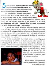 Et c’est le même cas, depuis la fenêtre branlante de ce Foyer pour Enfants dans le besoin de la Mission du Guatemala, après avoir examiner de nouveau avec notre petit doigt les lignes de ce conte ; les yeux maintenant portés vers cet horizon lumineux où nous savons que tu existes et que tu vis en ciselant des fantaisies et en assumant des réalités, unis dans les traditions et dans les espoirs, nous avons prié le même Dieu et notre Père pour ce même rêve qui nous enlace, pour ce même sentiment solidaire d’amour fraternel, de généreux devoir et de conviction chrétienne. (original ici).