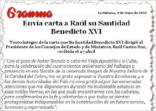 Le quotidien Ganma, organe officiel du Parti communiste cubain, publie sur son site le texte d'une lettre que le saint-Père a envoyée à Raul Castro.