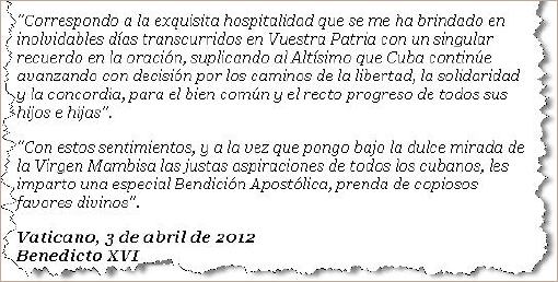 « Avec la joie d’avoir mené à bien mon Voyage Apostolique à Cuba, pour la célébration du 400ème anniversaire de la découverte et de la présence dans cette Nation de la vénérée statue de Notre Dame de la Charité du Cuivre, il m’est agréable d’exprimer à Votre Excellence et aux autres Autorités du Pays, ma vive gratitude pour les attentions exquises que vous m’avez dispensées durant mon inoubliable séjour en ces nobles terres, où j’ai pu rencontrer les Cubains, pour les confirmer dans leur foi et pour les encourager à ce qu’ils se sentent tous des acteurs indispensables dans la construction d’un futur serein, lumineux et prometteur ».
