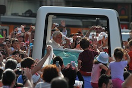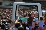 Puis, en un éclair, les voitures bleues (ndt: de la police) passent devant moi, et j'entends des voix: «Il arrive!». L'écho des applaudissements devient de plus fort en plus fort. Je me dresse sur la pointe des pieds pour scruter la Piazza Fontana à la recherche de la voiture blanche. La voilà. La dame me demande: «Allons-nous crier "Viva il Papa!"?». Bien sûr que oui. Il s'approche. Il passe devant moi, à quelques mètres. Je crie: Viva il Papa! Et je le regarde. Je ne pense à rien. Mais mon regard ne le quitte pas.
