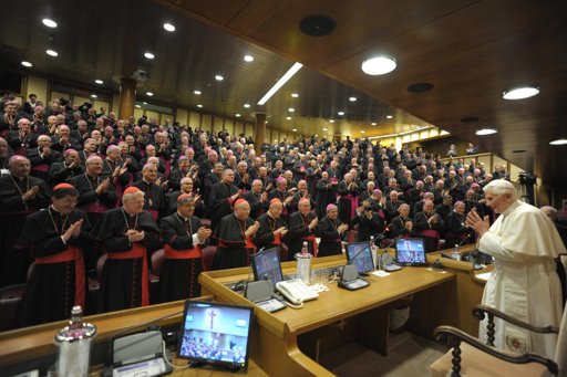 L'esprit de collégialité qui vous anime nourrit toujours davantage votre collaboration au service de la communion ecclésiale et du bien commun de la nation italienne, dans le dialogue fructueux avec ses institutions civiles. Dans ce nouveau quinquennat, poursuivez le renouveau l'Eglise qui nous a été confié par le Concile Vatican II; puisse le 50ème anniversaire de son début, que nous célébrerons à l'automne, être un motif pour l'approfondissement de ses textes, condition d'une réception dynamique et fidèle. « Ce qui intéresse plus que tout le Concile est que le dépôt sacré de la doctrine chrétienne soit conservé et enseigné de façon plus efficace», déclarait le Bienheureux Pape Jean XXIII dans son discours d'ouverture. Et cela vaut la peine de méditer et de relire ces paroles. Le Pape engageait les Pères à approfondir et à présenter cette doctrine pérenne en continuité avec la tradition millénaire de l'Église, «transmettre la doctrine pure et entière, sans atténuation ni déformation», mais de manière nouvelle «selon ce qui est requis par notre époque» ( Discours prononcé lors de l'ouverture solennelle du Concile Vatican II , le 11 octobre 1962 ). Avec cette clé de lecture et d'application, non certes dans l'optique d'une inacceptable herméneutique de la discontinuité et de la rupture, mais d'une herméneutique de la continuité et de la réforme, écouter le Concile et faire nôtres ses indications autorisées, constitue la route pour identifier les moyens par lesquels l'Eglise peut offrir une réponse valable aux grandes transformations sociales et culturelles de notre temps, qui ont des conséquences visibles sur la dimension religieuse.