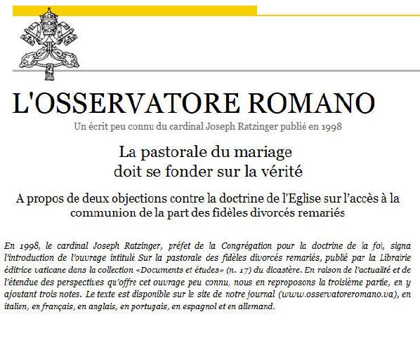 - que parmi les activités de la congrégation pour la doctrine de la foi figure notamment une nouvelle publication, dans "L'Osservatore Romano" du 30 novembre 2011, d’un texte de celui qui était alors le cardinal Joseph Ratzinger, publié en 1998 dans un livre intitulé "À propos de la pastorale des divorces remariés” (1) Cette nouvelle publication – est-il indiqué – visait à "attirer l’attention des pasteurs" sur cet ouvrage, "malheureusement peu connu", qui rappelle la position traditionnelle du catholicisme à ce sujet et dans lequel, notamment, il est confirmé que la pratique des Églises orthodoxes consistant à admettre, à certaines conditions, un deuxième mariage, puis un troisième, après l’échec du précédent reste "inacceptable pour des raisons doctrinales".