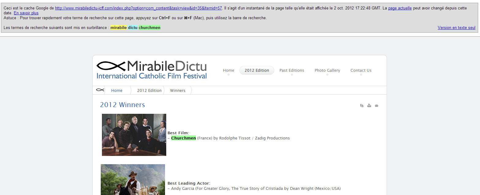 Alors que le cache de Google témoigne que le 2 octobre, le film "Churchmen" avait bien obtenu le prix (capture d'écran ici