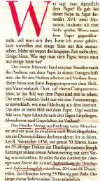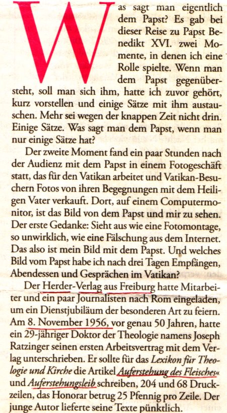 Ce reportage paru dans Die Zeit en novembre 2006, et traduit plus tard par ma chère amie Marie-Anne, relatait la visite à Rome des dirigeants de la maison d'édition Herder à l'occasion du cinquantenaire de la publication du 1er article de Joseph Ratzinger.