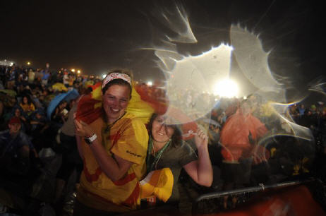 Action de Dieu ou pas, 20 minutes après, le vent tomba et un grand calme se fit. « Après la pluie, le beau temps » diront les rationalistes. Certes. La tempête apaisée laisse place à une nouvelle exultation collective : des jeunes défient le ciel avec leur parapluie, les drapeaux retrouvent leurs orgueilleux mouvements, les slogans se font entendre à nouveau avec plus de vigueur : « Esta es la juventud del Papa ! ».