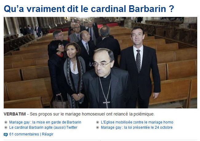 Europe 1 convoque des activistes gay (l'un d'eux a misérablement déclaré que ce qui le choquait le plus, c'était que pour "Mgr" Barbarin, la loi de Dieu comptait davantage que la loi du parlement!!!) , dont le représentant du groupe "David et Jonathan", l'ex-ministresse "de droite" Jouanneau, le méchant inoxydable "vert" Mamère, la ministresse "de gauche" Belkacem, et même des fidèles à la sortie de la messe, pour jeter des boules puantes sur l'archevêque de Lyon. Sans oublier l'artiste "maison", le pitoyable Guy Carlier qui, en service commandé par ses employeurs, et dans une inversion révoltante, a osé associer le nom de cardinal Barbarin au mot "barbarie"!