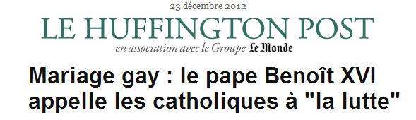 Son discours à la Curie romaine semble avoir été lu, certes entre les lignes, mais correctement dans la substance, par la porte-parole de la principale chaîne de télé française: "Le Pape appelle les catholiques français à lutter contre le 'mariage pour tous'". Journal de TF1 (23/12/2012).