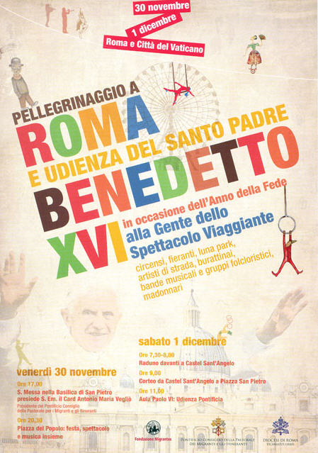 Le 1er Décembre, Benoît XVI étreindra le monde du cirque et tout le secteur du divertissement populaire (cirque, forains, artistes de rue, groupes et artistes, etc.), un évènement qui s'insère dans l'«Année de la Foi» et dans le programme du 25e anniversaire de la Fondation Migrantes (1987-2012).