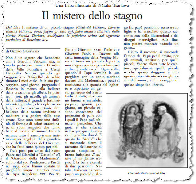 Du livre "Il mistero di un piccolo stagno" (le mystère d'un petit étang), conte imaginé et illustré par la peintre Natalia Tsarkova, nous anticipons la préface écrite par le secrétaire particulier de Benoît XVI.