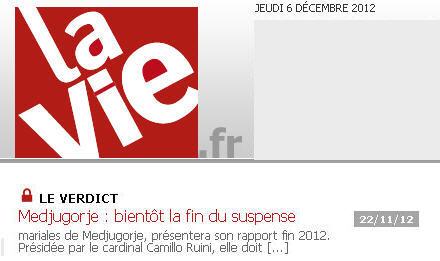 La Vie a publié le 22 novembre dernier une information en forme de scoop: l'article original, qui titrait "Medjugorje: bientôt la fin du suspense" est en accès payant.