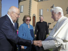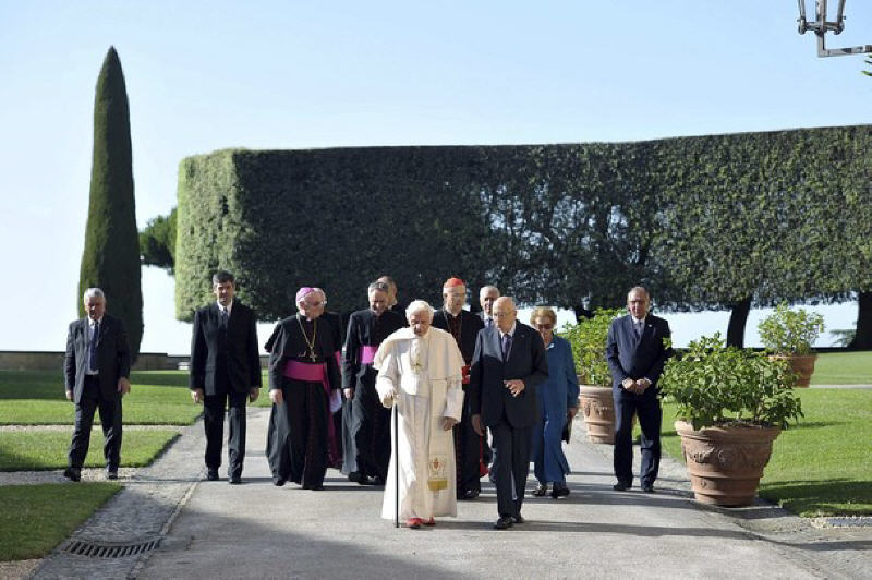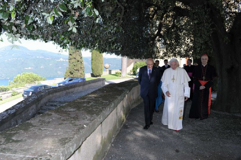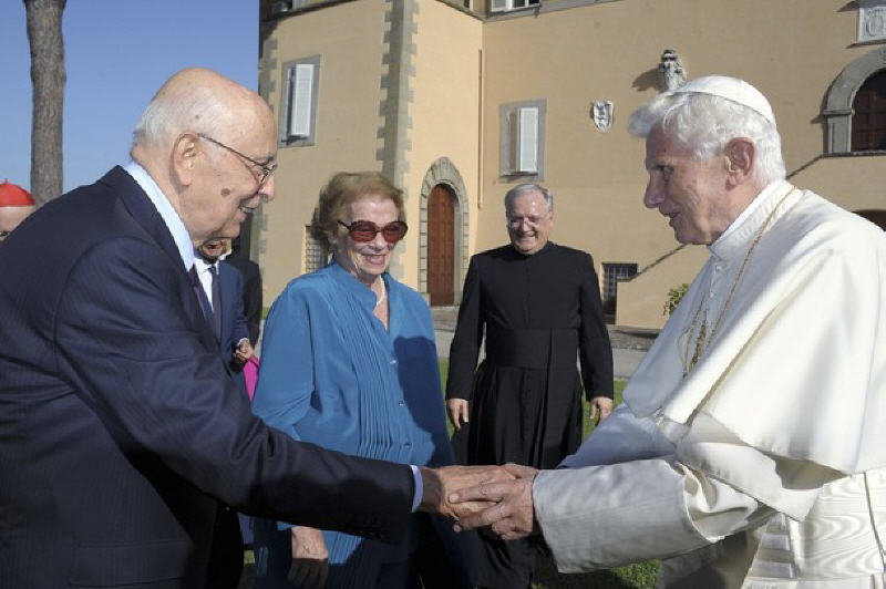 Six ans se sont écoulés depuis le début de mon mandat. Au mois de mai a commencé la dernière des sept années prévues. Je n’hésite pas à confesser que l’une des composantes les plus belles qui ont caractérisé mon expérience a été précisément la relation avec Benoît XVI. Nous avons découvert ensemble une grande affinité, nous avons vécu un sentiment de grand respect réciproque. Mais il y a plus, quelque chose qui a fait vibrer nos cordes humaines. Et je lui en suis très reconnaissant. Aujourd’hui, par exemple, nous avons passé un moment ensemble caractérisé précisément par une grande simplicité humaine. Nous nous sommes promené, nous avons parlé comme des personnes qui ont une relation d’amitié sincère, avec tout le respect que j’ai pour lui et pour son très noble ministère, pour sa très haute mission. Nous nous sentons dans un certain sens proches, notamment parce que nous sommes appelés à gouverner des réalités complexes. Le Pape naturellement, outre un «chef d’Etat», est également et surtout le guide de l’Eglise universelle. Pour ma part je me trouve au sommet des institutions de la République italienne à un moment très, très difficile. Il est nécessaire de faire prévaloir dans tout contexte de puissantes motivations de sérénité, de paix, de modération. Voilà, je ressens très fortement ma mission de modérateur: et que dire de la mission analogue qui est celle du Pape?