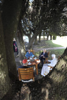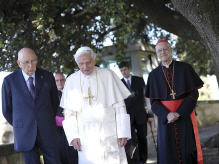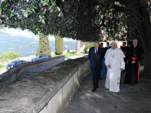 A l'issue du concert en son honneur, le Saint-Père s'est promené dans le parc surplombant le lac d'Albano avec Giorgio Napolitano, président de la République italienne. Images (12/7/2012)