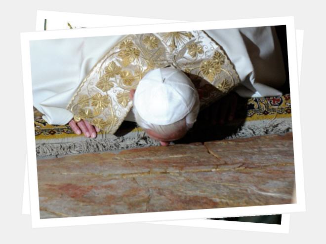 J'ai du mal à trouver les mots pour décrire ce que j'ai vécu spécialement au Saint Sépulcre. Devant moi, j'avais de dos un homme agenouillé immobile, pas de quoi pour un photographe multiplier les clichés... ce n'est pourtant pas cela qui a fait taire le crépitement des appareils photos mais bien plutôt le sentiment d'assister à un moment si fort qu'il fallait communier au moins par respect à ce moment d'intimité entre le pape et son Seigneur. Intimité? Oui et non. Puisque nous étions tous dans cette prière. Je me suis sentie portée par elle, moi et avec moi toute l'Église de Terre Sainte et avec nous toute l'Église universelle. Le pape ne semblait pas porter sur ses épaules un fardeau, mais il s'offrait et nous présentait au Seigneur tous, un à un, le milliard de chrétiens mais aussi un à un les juifs, les musulmans, toute l'humanité. Le saint et le pécheur ensemble, le traditionaliste et le progressiste. Tous ensemble dans le coeur de Benoît XVI, bénéficiant de la même sollicitude puisque c'est à celle de Dieu qu'il en appelait. C'est dans la force de cette prière-là que tout le reste prend sens, le dialogue interreligieux et oecuménique, les affirmations politiques aussi.