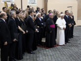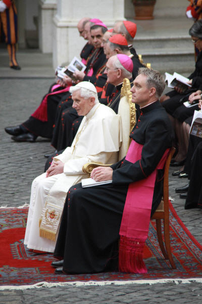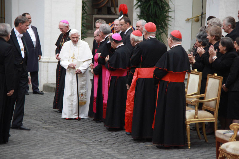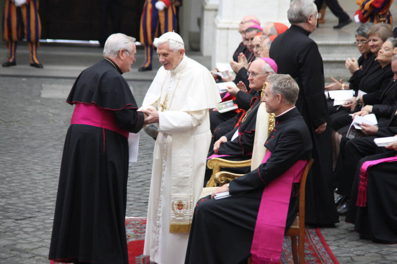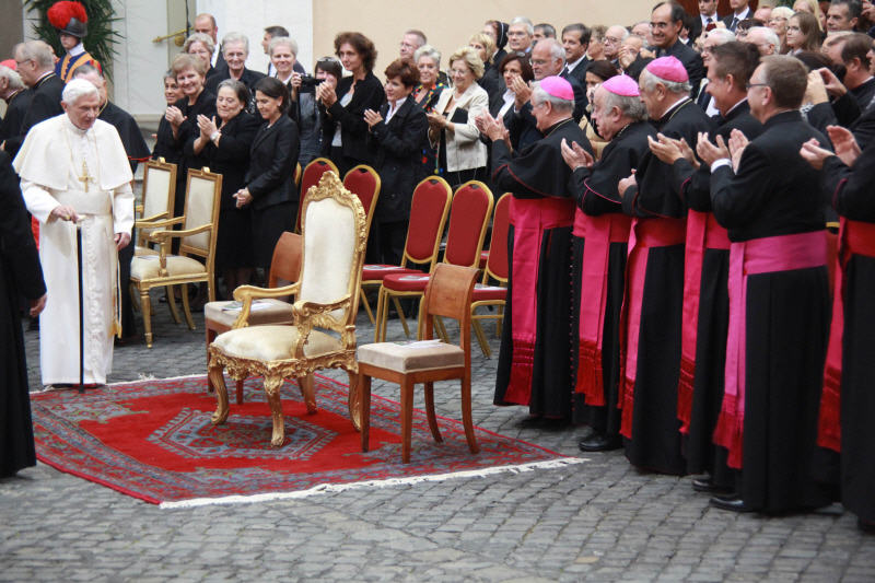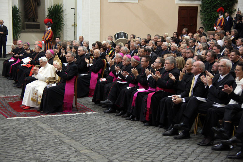 Lorsque le pape Benoît XVI prend la parole, la familiarité avec ses compatriotes de sa patrie bavaroise est immédiatement perceptible. «Cher Evêque Hofmann, Cher Monseigneur Scheele, chers invités de Wurtzbourg et de Franconie», dit-il aux quelque 200 invités d'honneur de Basse-Franconie et des environs, présents à Rome pour le Symposium sur Saint Augustin qui se tient actuellement. Avec un cordial «Merci Dieu vous bénisse» (herzlichen Vergelt’s Gott), il remercie Mgr Friedhelm Hofmann, de l'Institut Augustinien de Wurtzbourg, et tout le diocèse de Würzbourg pour le don de cette performance. Les remerciements du pape s'adressent également aux artistes du Chœur de chambre de la cathédrale de Wurtzbourg, aux solistes et instrumentistes, ainsi qu'au maître de Chapelle Berger.