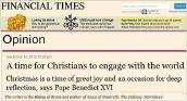 A l'occasion de Noël, une initiative assez exceptionnelle. Le Pape enjambe les canaux habituels de communication pour s'adresser directement aux hommes de bonne volonté. Il le fait en anglais, à travers un journal de la presse "mainstream" susceptible d'atteindre le plus grand nombre de gens, Le Financial Times. Ma traduction du texte, à partir de l'original en anglais publié sur le site de Teresa (20/12/2012)