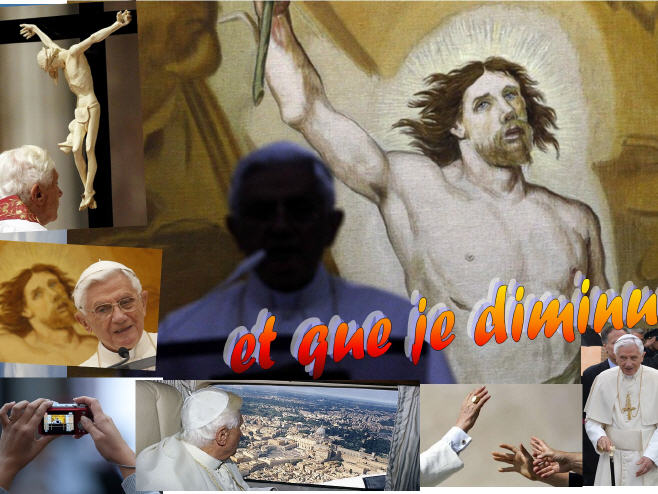 Questo testo preso dall'omelia della inaugurazione del Pontificato sempre mi ha fatto pensare a questo testo di Giovanni 3,30: "Bisogna che egli cresca, e che io diminuisca". Man mano che passa il tempo questo é sempre piú vero. Che la grazia, la fortezza del Signore e tutti i doni dello Spirito Santo lo accompagnino sempre e possa avere salute sufficiente per poter aiutare la Chiesa, tutti noi ancora. ... Le foto vogliono dire qualche cosa.
