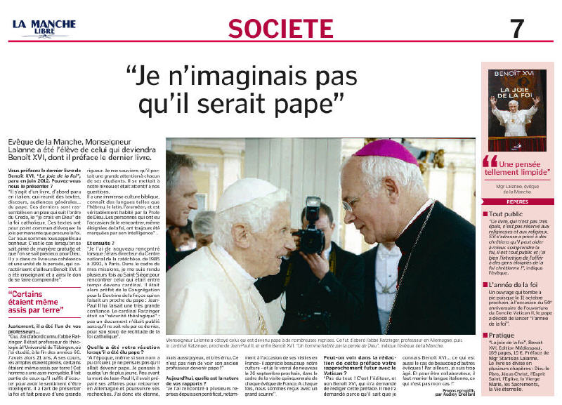 Un recueil de textes du Saint-Père, préfacé par Mgr Lalanne, évêque de Coutances et Avranches, qui s'exprime sur "La Manche Libre" (12/8/2012)