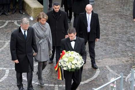 Image ci-contre: Le Prince Philippe et la Princesse Mathilde rendent hommage aux victimes, Place Lambert, le 20 décembre 2011.