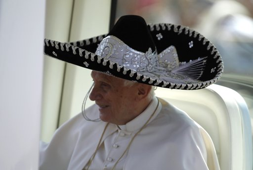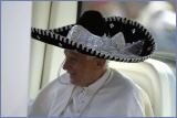 Ils lui ont lancé un sombrero noir et blanc tandis qu'il traversait en «papamobile» le parc du Bicentenaire, et Benoît XVI, avec l'aide de son secrétaire personnel don Georg l'a mis sur sa tête, jusqu'au stade où il allait célébrer la messe. Un sombrero noir et blanc, le typique chapeau "Charro" à larges bords de la tradition mexicaine. Benoît XVI l'a endossé, lors de sa tournée en «papamobile» à travers la foule du Parc du Bicentenaire de Leon, qui était venue pour la msse. Parmi les centaines de milliers de personnes qui l'ont acclamé et fêté, quelqu'un a réussi, derrière les barricades, à lui lancer un sombrero que Ratzinger a arboré, visiblement heureux, sous les applaudissements.