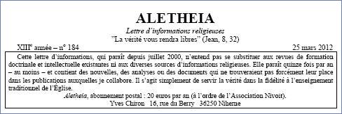 (*) La lettre d'informations religieuses ALETHEIA paraît 15 fois par an.