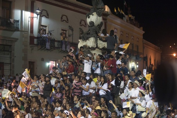 Le long du parcours pour aller à la cathédrale Notre-Dame de la Lumière de Leon pour les Vêpres, vitres baissées, la foule joyeuse accompagne Benoît XVI portant la mozette rouge. La papamobile est cernée de voitures, de motos. Il est souriant, simple, les vivats fusent, la liesse ne faiblit pas, les confettis retombent par moments, des ballons s'envolent et la nuit vient.