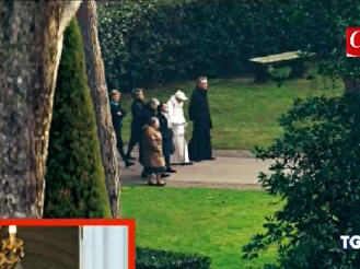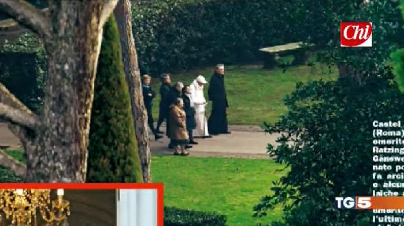 L'objectif les encadre tandis qu'ils marchent le long d'une allée dans la verdure, parmi les arbres, les haies et un coin de prairie. On peut imaginer qu'ils récitent le chapelet: Benoît XVI avait l'habitude de se promener dans les jardins du Vatican avec la couronne de l'Ave Maria. Derrière eux, presque entièrement cachée par un arbre, on entrevoit juste une troisième figure vêtue de noir, peut-être l'un des quatre « Memores domini» qui ont voulu suivre Ratzinger aussi dans cette «dernière étape de mon pèlerinage sur cette terre», comme il l'a dit en prenant congé [ndt: en réalité, l'autre photo, une capture d'écran de la "5" italienne, prouve que les memores sont effectivement aux côtés du Saint-Père].