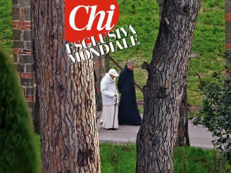 «Caché au monde», mais pas aux photographes. Voici, au cinquième jour du pape émérite, la première image de Joseph Ratzinger, publiée par l'hebdomadaire "Chi" (ndt: du groupe Mondadori, propriété de la famille Berlusconi: j'ai acheté le journal sur ma tablette, et l'article est vraiment très bienveillant, ce qui prouve, entre autre, qu'il y a des lecteurs à satisfaire).